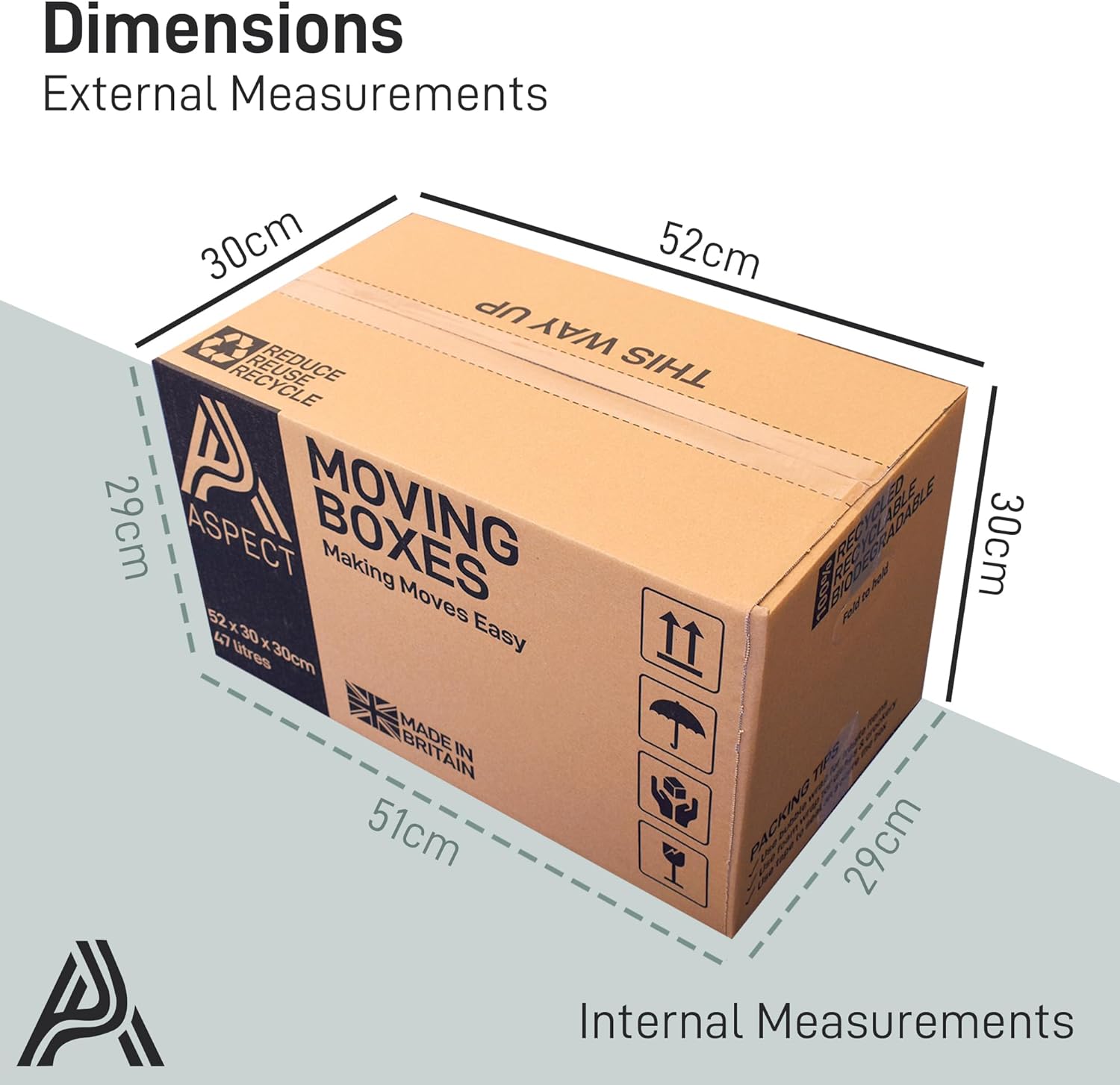 Aspect 5 Strong Large Cardboard Storage for Moving House 52cm x 30cm x 30cm Storage Packing Boxes With Lids Storage Boxes for Packing With Carry Handles - 47 Litres