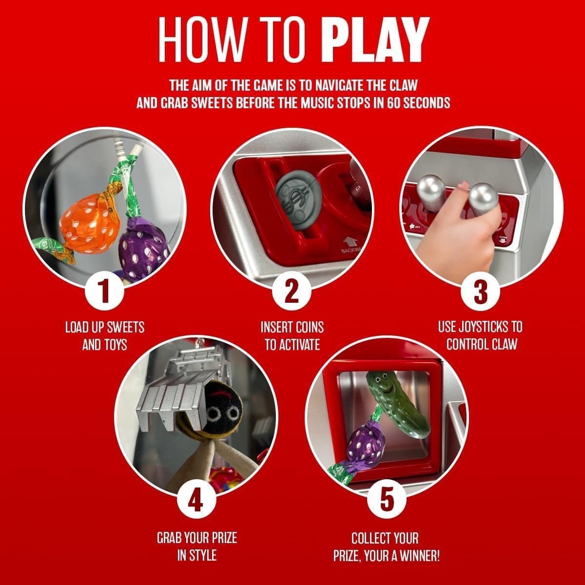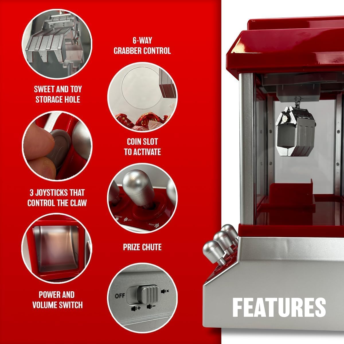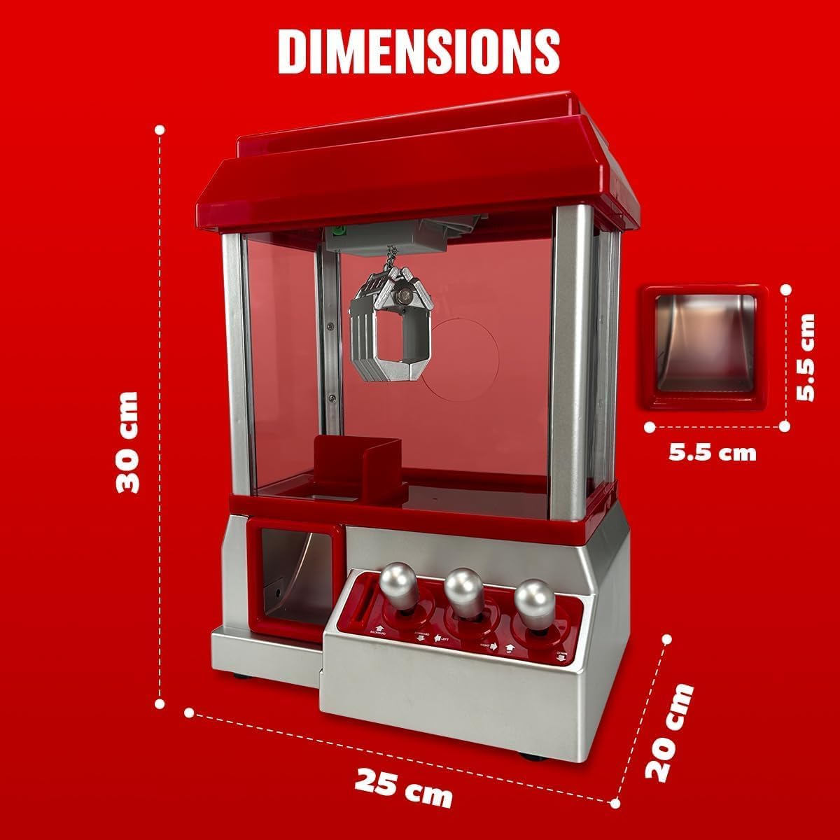 - CLASSIC DESIGN: Miniature arcade claw machine brings the excitement of fairground games home, featuring a classic red and silver colour scheme and authentic arcade-style controls