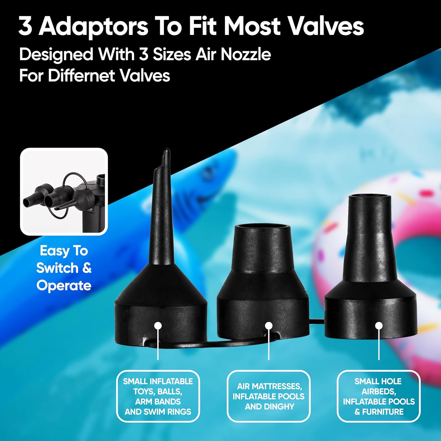 - INCLUDES 3 NOZZLES: This electric pump for inflatables comes with three different nozzles that easily attach to fit all standard valves, perfect for air mattresses, pool floats, inflatable pools, rafts, sofas, water beds, boats, pool toys, swimming rings and more.